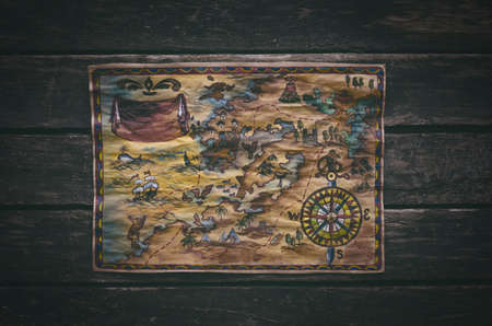 Pirate treasure map with gold mark on aged wooden table background. Top view photo.