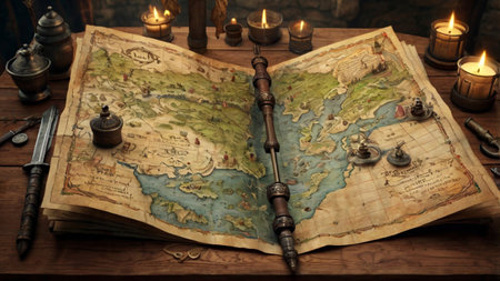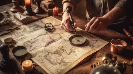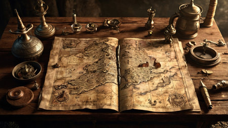 Background with a pirate treasure map, brown wooden table, and other series.Generative AI