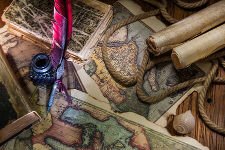 Vintage map. Treasure hunt concept. Pirate still life with old map, compass, spyglass, candlestick and candles