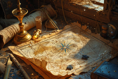 A vintage map displayed alongside an intricate collection of nautical tools, evoking a sense of adventure and history.