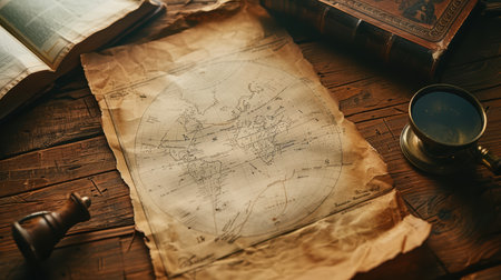 A vintage world map spread on a rustic wooden table with old books and a cup of tea nearby. This image evokes a sense of exploration and adventure, ideal for travel-related themes.