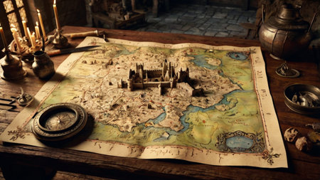 Cinematic depiction of a castle guardroom with maps and weaponry on a wooden table