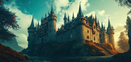 A stunning view of a majestic castle rising at sunrise by a serene river, capturing the beauty of medieval architecture and nature's tranquility.