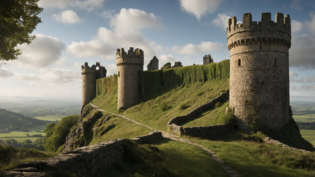 This image features a majestic medieval castle atop a scenic hillside, flanked by robust stone walls and surrounded by lush greenery, beneath a bright blue sky interspersed with clouds. AI generated image