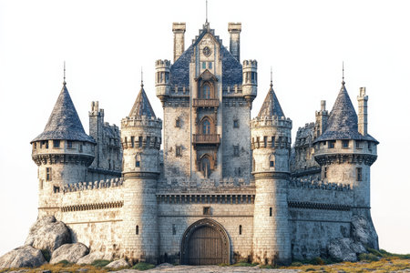 A medieval castle stands prominently, showcasing stone walls and tall towers. Surrounding the structure are rugged rocks and patches of wild grass. The castle's wooden door and windows hint at an ancient history, basking in sunlight.