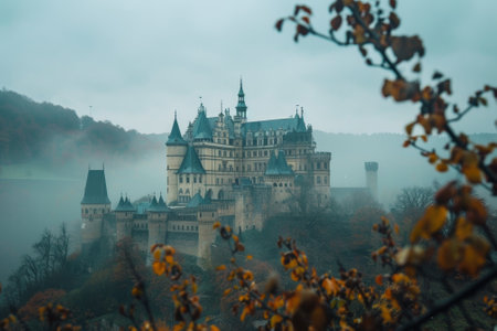 A castle with a foggy sky in the background. The castle is surrounded by trees and leaves