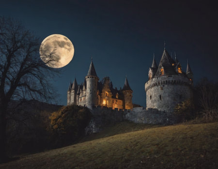 A stunning view of a historic stone castle illuminated under a starry night sky, showcasing dramatic shadows and ancient architectural features.