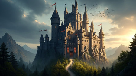 A majestic medieval castle perched atop a rocky mountain surrounded by lush greenery