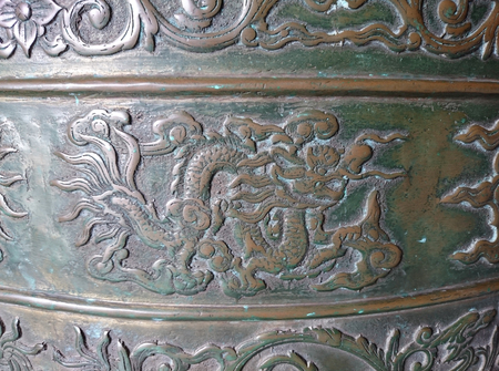 Old metal relief - probably bronze - in buddhist temple of Ninh Binh, Vietnam, South-East Asia. Highly decorative surface covered with dragons and floral ornament pattern. Green and red metallic texture is antique, even ancient.