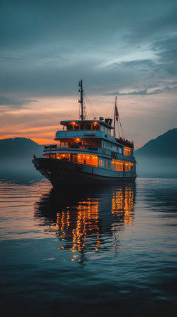 A beautiful boat is anchored in calm waters at dusk, surrounded by misty mountains. The soft glow of lights reflects on the lakes surface as evening approaches.