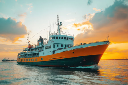 Passenger ferry in the sea at sunset. Passenger ship on the water.