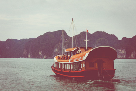 HA LONG BAY, VIETNAM - NOVEMBER 13, 2018: Halong Bay, Vietnam. Unesco World Heritage Site. Traditional tourist boats.