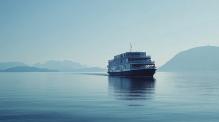 A tranquil scene of a ferry navigating through calm waters, with a backdrop of distant mountains and clear skies, highlighting maritime transportation