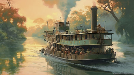 A captivating and picturesque scene of a majestic steamboat gracefully navigating through a foggy river landscape. Generative AI