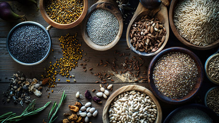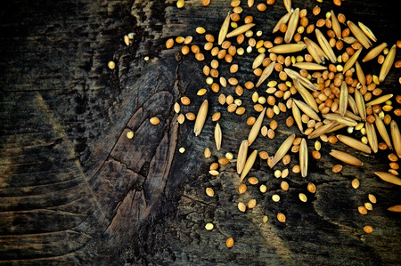 Variety kinds of dry organic cereal and grain seed pile in dark tone, for healthy or clean food ingredient or agricultural product concept