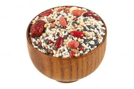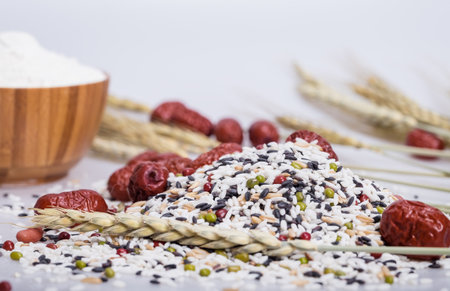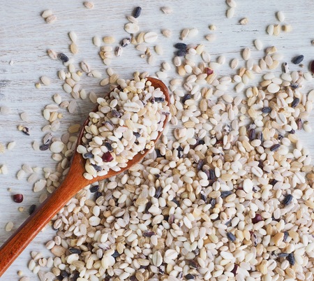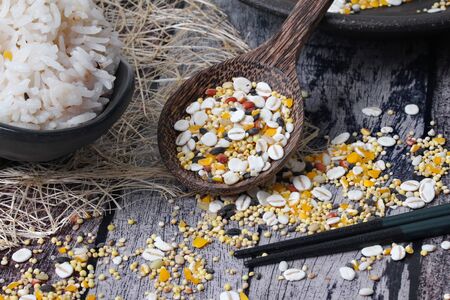 16 Traditional seed cereals for cooking with rice from Japan and ready served of Thai jasmine rice that has been cooked with Japanese cereals on old wooden pattern.