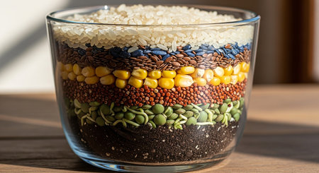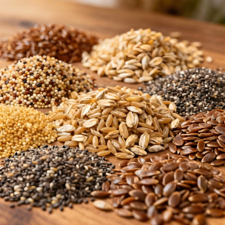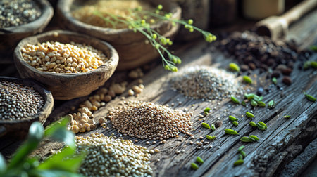 Variety of healthy grains and seeds in a wooden box mostly gluten free with rice, Sensitive Focus