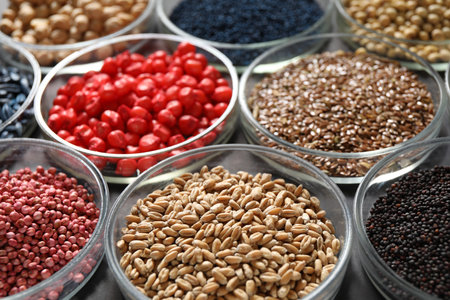 set of organic sprouting seeds in Petri dishes, counterwise from top left - fenugreek, radish, alfalfa, red clover and hard wheat