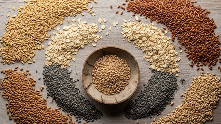 Organic brown rice displayed in a rustic setting for a healthy lifestyle