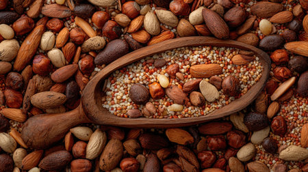 Top view of variety dry organic cereal and grain seed pile on wooden spoon on white background