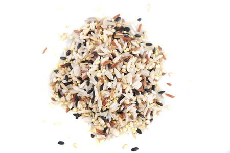 Mixed dry organic cereal and grain seeds pile on white background, for healthy or clean food ingredient or agricultural product concept
