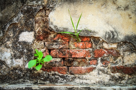 Green sprout growing out of old brick wall. Nature background.