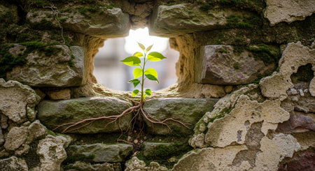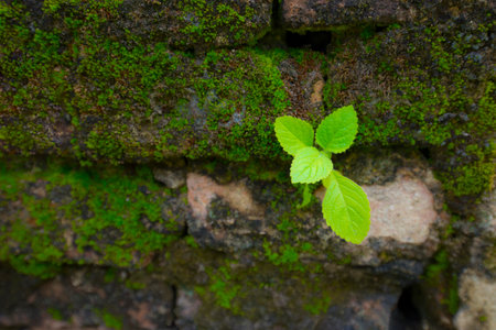 New green stem with leaves that grows in old stone wall