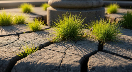 Green plants sprout into a crack between flat stones on the road