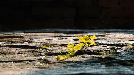 A plant grows through the stone ground. New plant life. Sunny day.