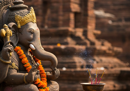 Close-up of a beautifully detailed statue of Ganesha, the Hindu god of beginnings, adorned with vibrant orange marigolds. Generative Ai