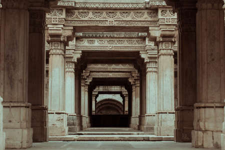 Columns with stone carving in courtyard of Quwwat-Ul-Islam mosque, Qutub Minar complex. It is UNESCO world heritage site at New Delhi,India