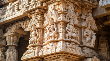 Elaborate stone carvings of deities adorn the columns of an ancient temple, showing intricate details and craftsmanship under gentle sunlight, highlighting their heritage.