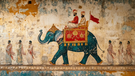 This stunning mural showcases a royal elephant parade, featuring elegantly dressed figures and intricate details, reflecting the rich cultural heritage of India. Perfect for art enthusiasts.