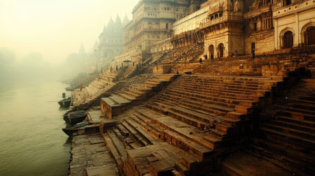 Empty Varanasi Ghats: The ancient ghats of Varanasi, with steps leading to the Ganges River,