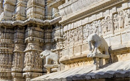 Stone carved elephant relief in Hindu temple in Khajuraho, India.