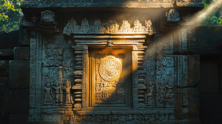 Ancient temple entrance, intricate stone carving, detailed sculpture, historic architecture, cultural heritage, spiritual atmosphere
