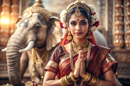 A beautiful Indian girl in a traditional Indian national costume, sari. Against the background of elephants. The portrait symbolizes the traditions, culture and beauty of the people of India.