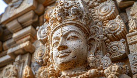 Ancient stone carving of a hindu deity in an ornate temple in india, showing the serene face and ornate crown of the deity