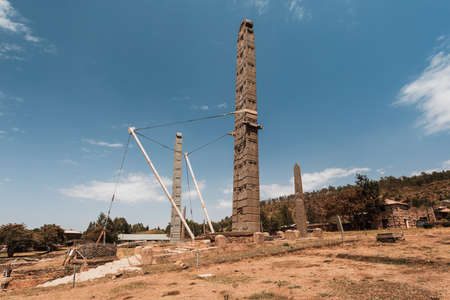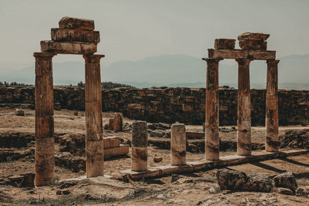 Ancient pillars in a historical site The image features three aged pillars, remnants of an ancient structure set against a rustic backdrop, hinting at a rich history.