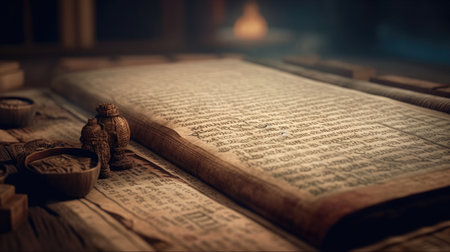A vintage open book featuring ancient script rests on a rustic wooden surface, showcasing the beauty of historical literature and craftsmanship in an atmospheric setting.