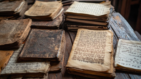 A collection of ancient books, scrolls, and manuscripts rests on a rustic wooden table, revealing their historical significance and wear.