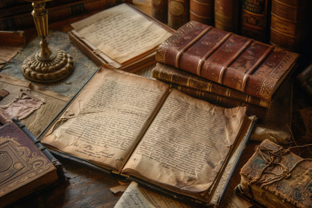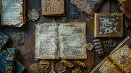 A collection of ancient books, scrolls, and artifacts lies scattered on a rustic table, revealing the rich history captured within.