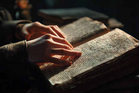 A pair of hands carefully turns the pages of an old book in a quiet, dimly lit library. The warm light highlights the textured pages and intricate details of the text.