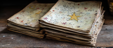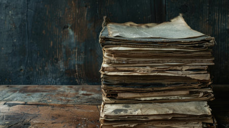Close-up of old South Asian manuscripts laid on a weathered wooden desk, ample copy space