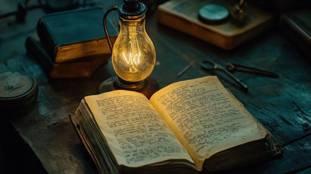 An open book lies atop a rustic wooden table, illuminated by soft light that creates gentle shadows. This scene evokes a sense of nostalgia and invites leisurely reading.