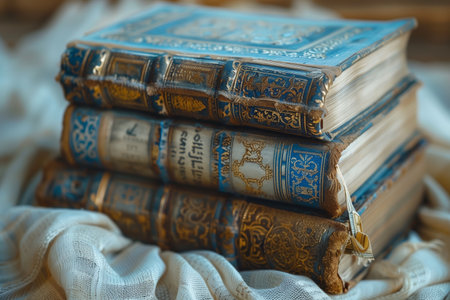 Antique leather-bound books stacked on a soft fabric surface, showcasing intricate designs and vibrant blue colors in warm lighting