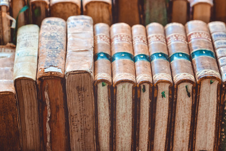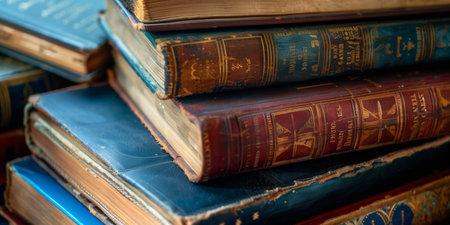 A collection of worn, vintage books stacked atop one another displays their aged spines and frayed edges. The textured covers hint at the stories contained within, inviting exploration and nostalgia for reader and scholar alike.