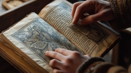 A close-up view of hands examining an ancient book filled with intricate illustrations and detailed text, showcasing the beauty of historic literature and craftsmanship.