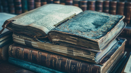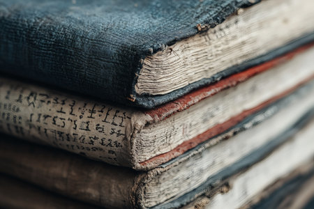 A close-up of an antique book stack, showcasing worn pages and intricate textures that reflect its rich history and timeless charm. Perfect for literary themes.