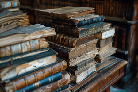 Stack of old books with worn covers lying on a wooden desk in a library or archive